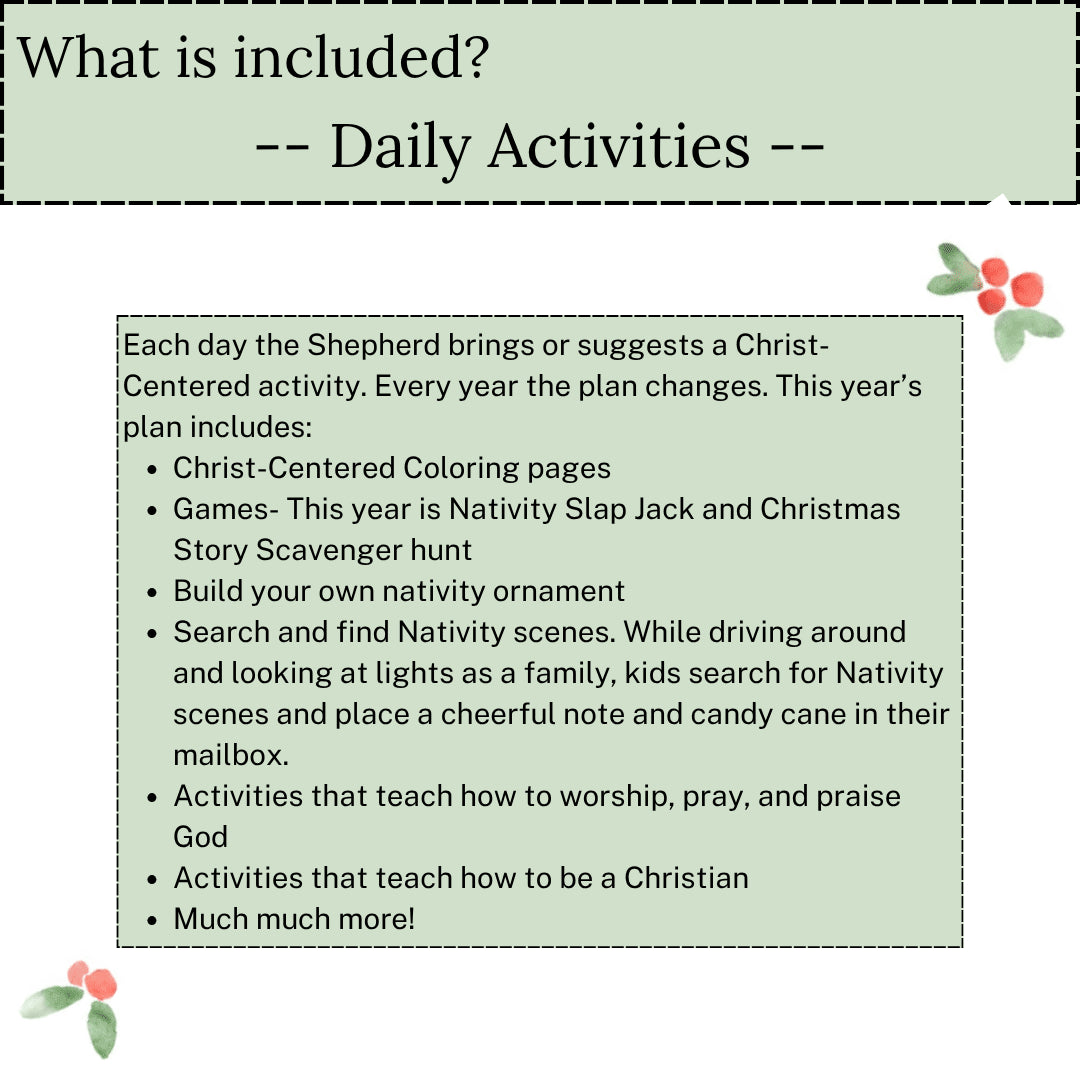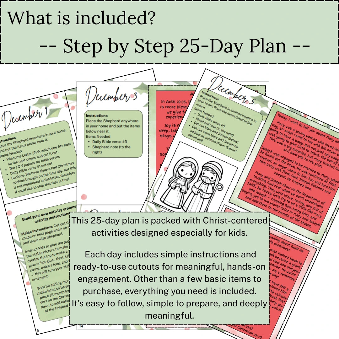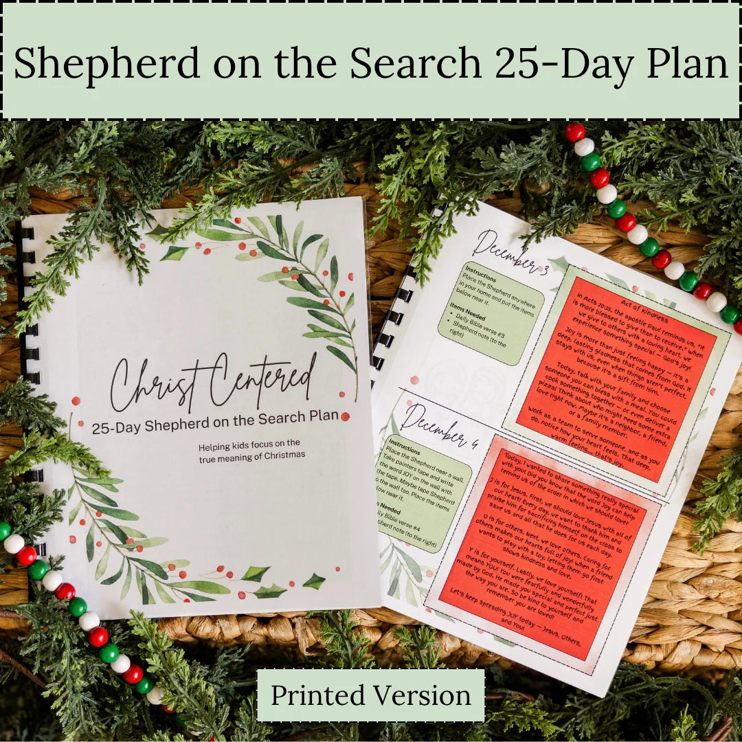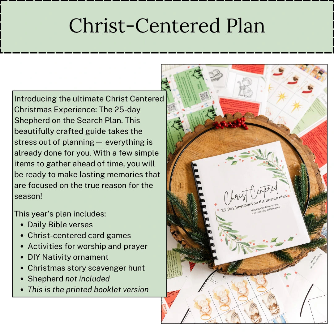 Introducing the ultimate Christ Centered Christmas Experience: The 25-day Shepherd on the Search Plan- printed version. Take the stress out of holiday planning with this ready-to-use guide. With just a few simple items to gather, you’ll enjoy meaningful, faith-filled moments all season long. Each day features Bible verses, Christ-centered games, worship activities, prayer prompts, a Nativity ornament craft, a Christmas story scavenger hunt, and more—perfect for families who want to celebrate faith and fun together. Shepherd not included.